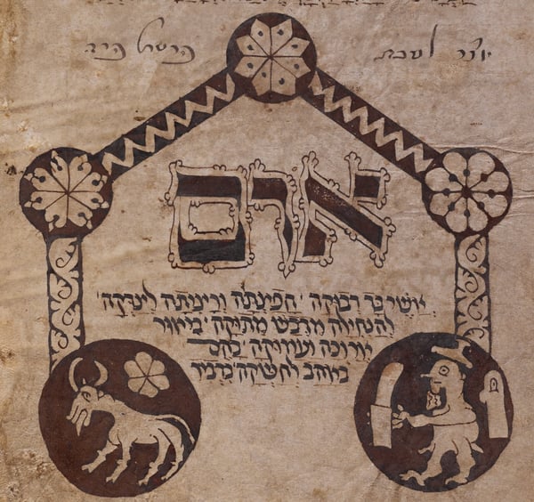 The images in the rondels at the bottom is an illustration of the biblical story of the Akedah—the Binding of Isaac. On the right, we see Abraham wearing a Jew hat but with a less bird-like face than other images in this manuscript; he is carrying the knife with which he will slaughter Isaac, the barely drawn small person to Abraham’s right. In the left rondel we see the ram that will replace Isaac for slaughter.