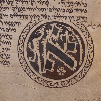 Typical of the Mahzor’s decoration is the large encircled “aleph,” accompanied by fanciful, “grotesque” creatures near the bottom of the page. If you look carefully at the hybrid creature to the left, you may recognize its top part as a typical “birds-head” representation of a Jew (such representations were found in medieval Ashkenazi manuscripts). The bird’s beak, along with the “Jew hat” on top, unmistakably locate this manuscript in time and place, though the meaning of this sort of image is unclear and much debated.