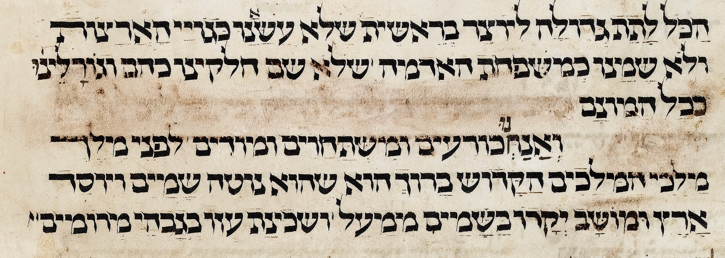 Copied in Esslingen, Germany, in 1290 by the scribe Kalonimos ben Yehudah, this mahzor contains prayers for Rosh Hashanah, Yom Kippur, and Sukkot. It is the earliest dated Hebrew book from Germany. The manuscript is large, with pages measuring 18 x 14 inches. Its size tells us that it was designed for synagogue use by the prayer leader, likely placed on a stand at the center of the prayer hall as the prayers were intoned for the entire congregation.