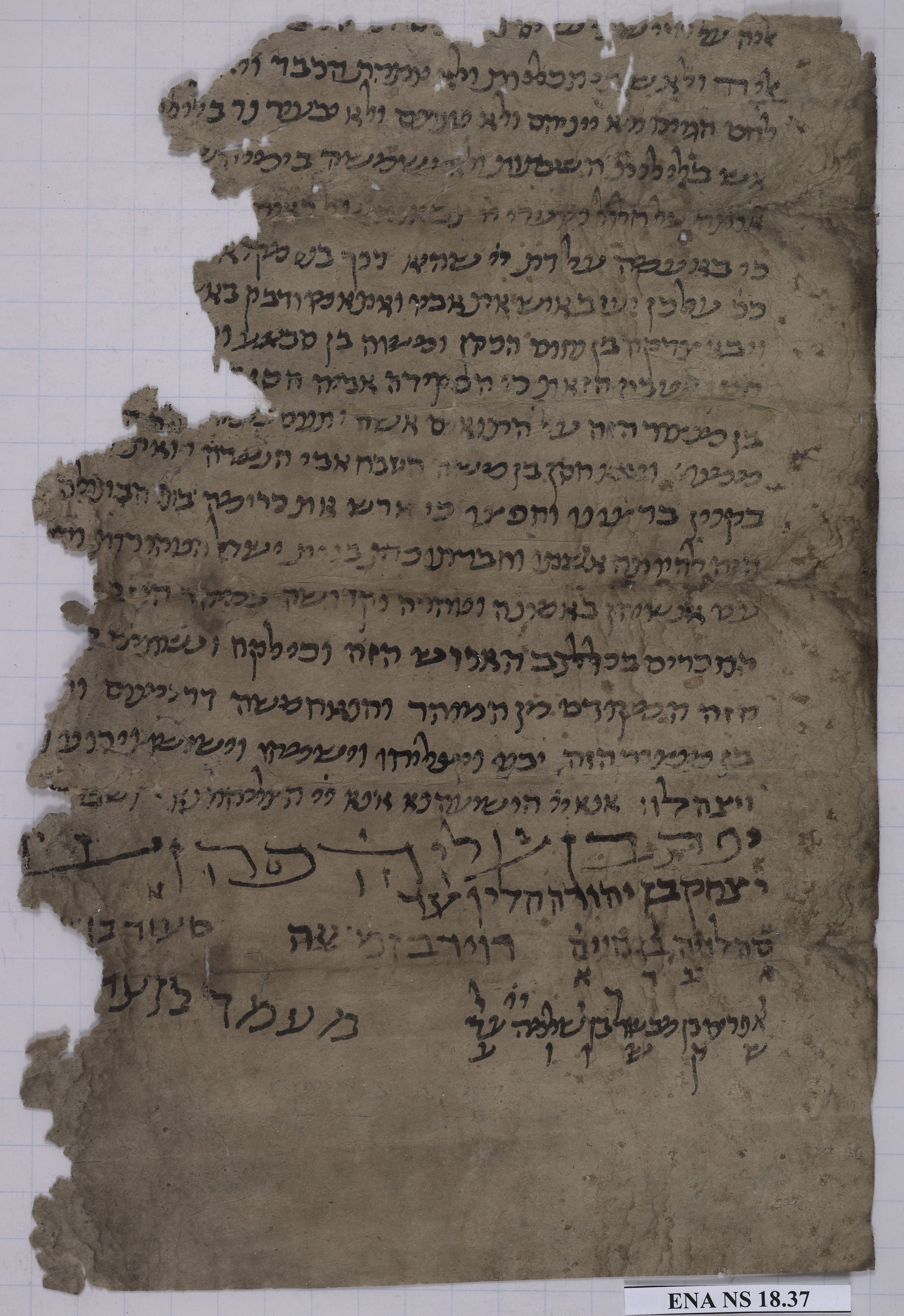 This ketubbah is written in Hebrew, unlike common ketubbot, written in Aramaic. Near the beginning of the text that survives (in the 2nd and 3rd visible lines) are conditions stipulating that the woman not be forced to light Shabbat lamps nor to have sexual relations on the Sabbath. These conditions reflect Karaite (= “scripturalist” Jews who rejected rabbinic authority) law, indicating that the bride is from a Karaite family and the groom from a family following rabbinic law. Before discoveries like this, scholars assumed that Karaite and Rabbanite Jews would have had problems marrying one another. This ketubbah shows one way that problems could be solved. Given that, according to the evidence of the Genizah, Karaites were much more numerous than was once believed, it is likely that such “intermarriages” were not a rarity.