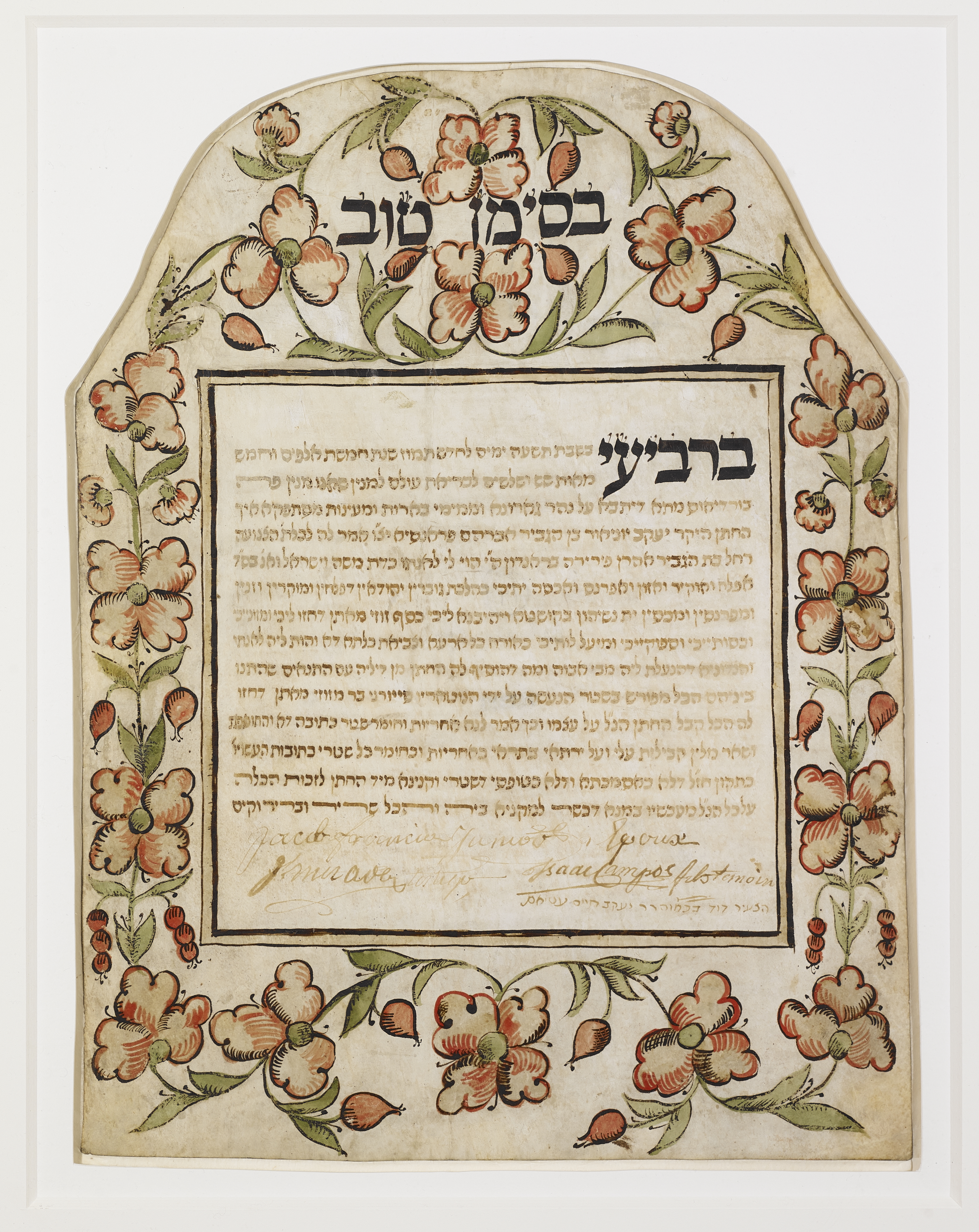 The simple floral decorative scheme of this document is typical of the Sephardi community of Bordeaux. Beneath the text, the groom has signed his name in Latin characters, a common feature in Sephardi ketubbot of Western Europe. However, neither the signature of the groom nor the fact that he uses local, not Hebrew letters, are traditional. Both are evidence of the acculturation of the Sephardic community in late pre-revolutionary France.