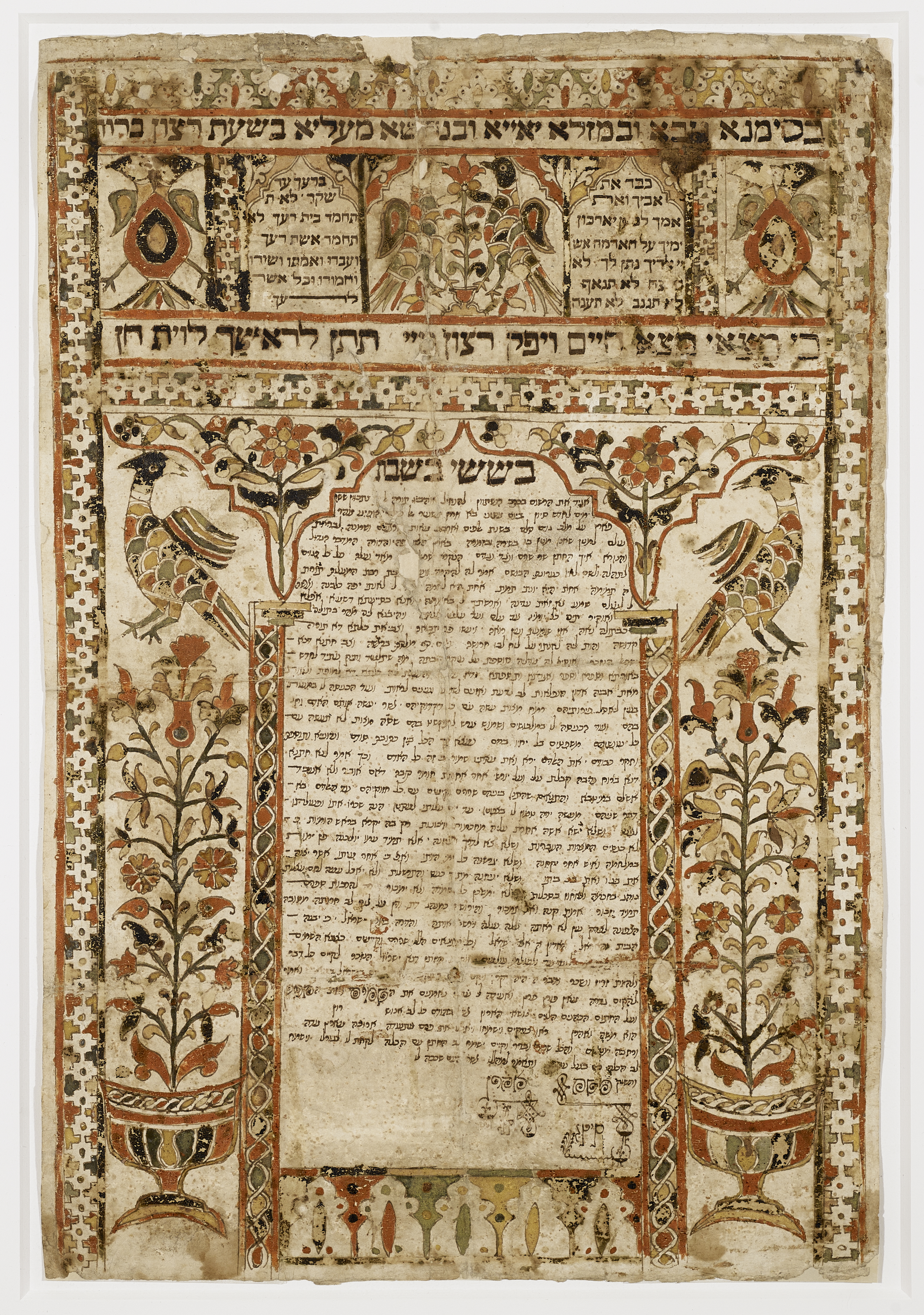 The Shavuot ketubbah was publicly chanted in the synagogue to a special melody. The text closely follows the wording of the standard rabbinical marriage contract but sets the wedding at Mount Sinai on the 6th of Sivan (Shavuot), with Moses and Aaron as witnesses. The decorative program of this document is quite similar to that of ketubbot from Tetuan, Morocco, of this period.