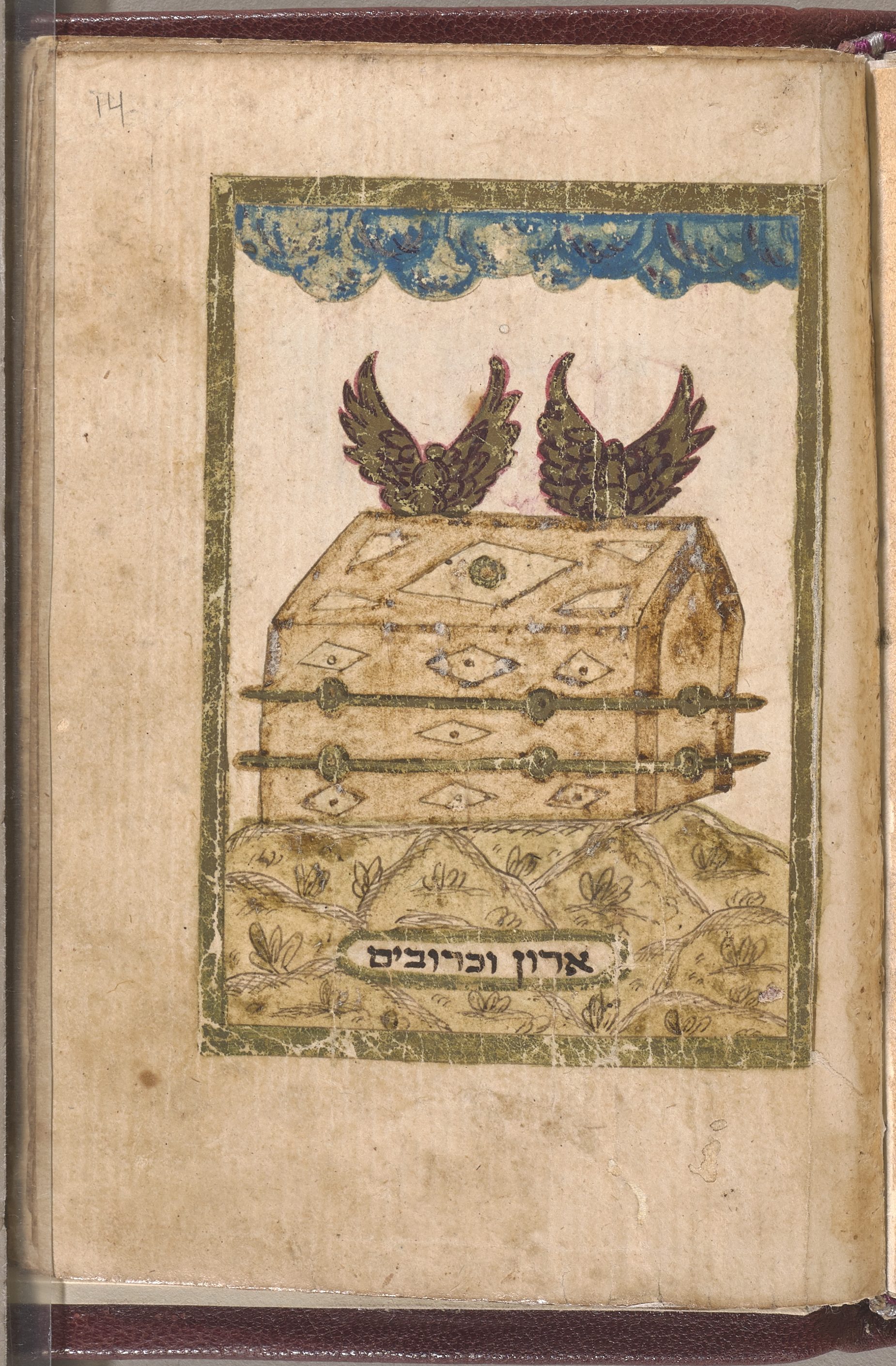 This page is one of several illustrations of biblical scenes from the Exodus cycle. You can see the (presumably newly constructed) ark of the covenant with the cherubim upon it.