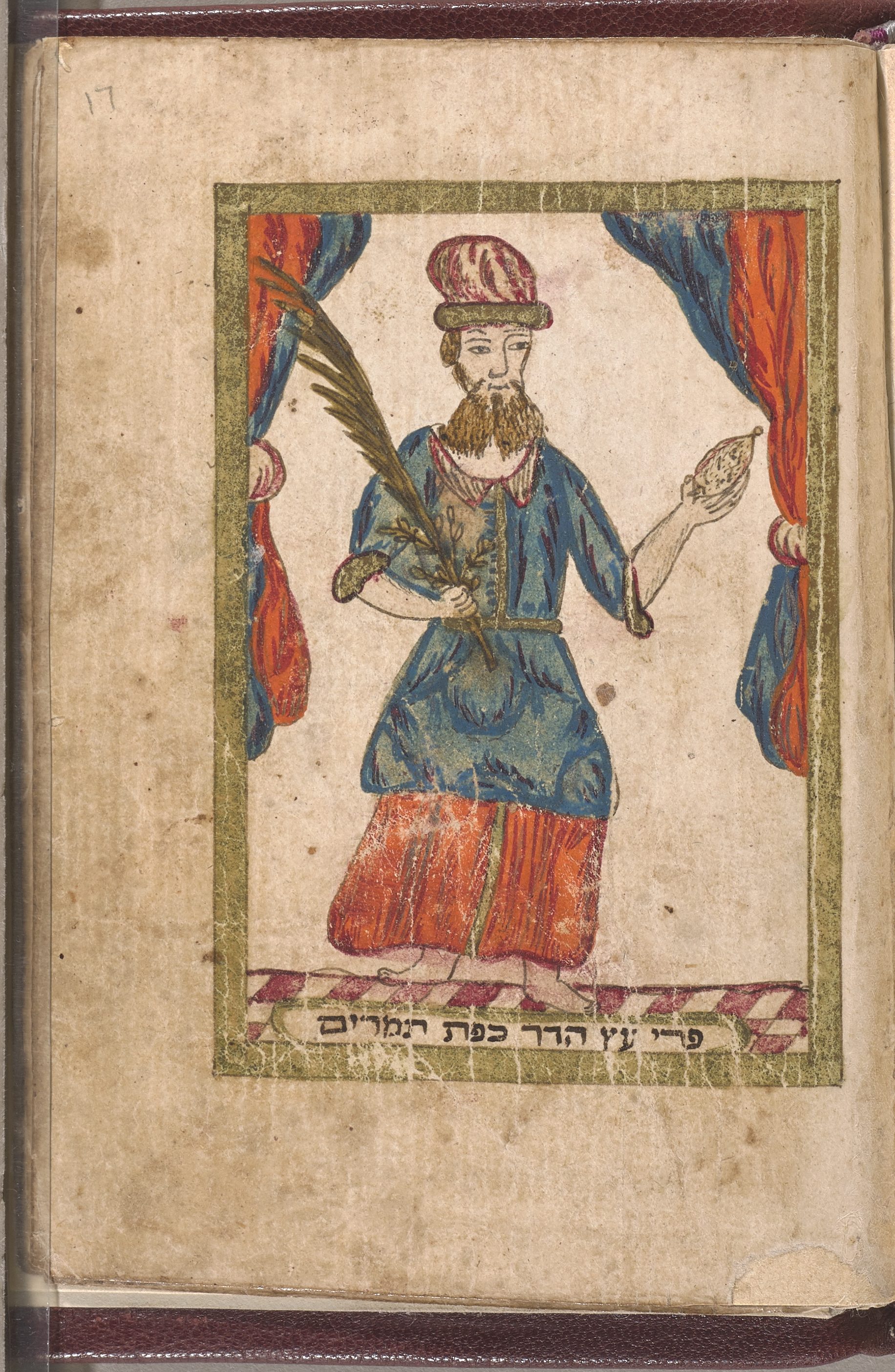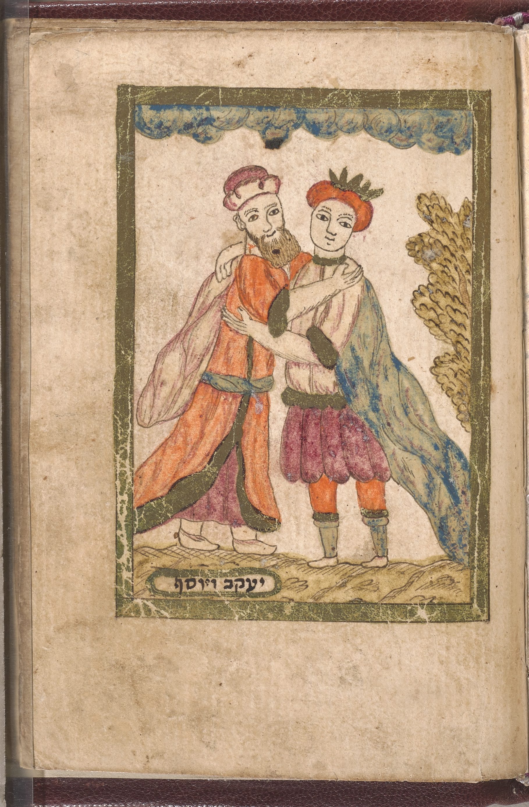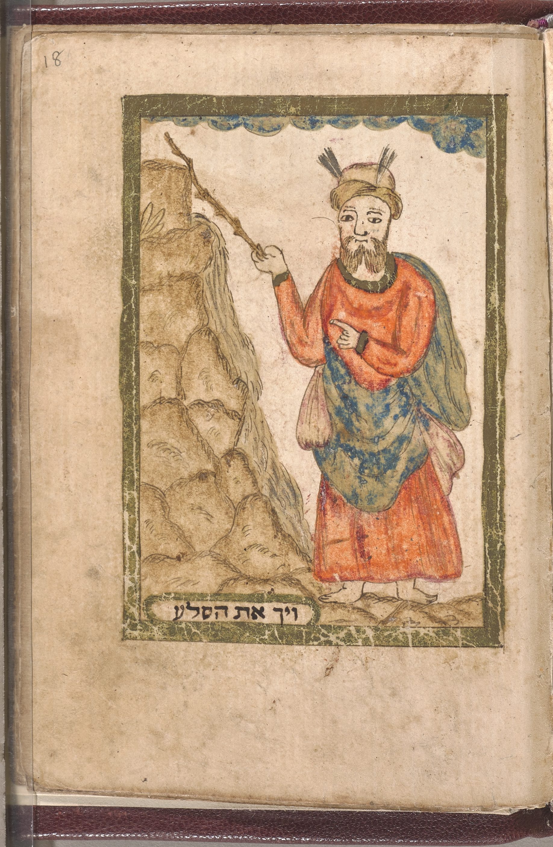 This page is one of several illustrations of biblical scenes from the Exodus cycle. You can see here a group of Jews enjoying a meal in a sukkah—a booth that was the temporary dwelling in the desert. Note the dress of those represented; their garments are unmistakably in the fashion of 18th century Greece.
