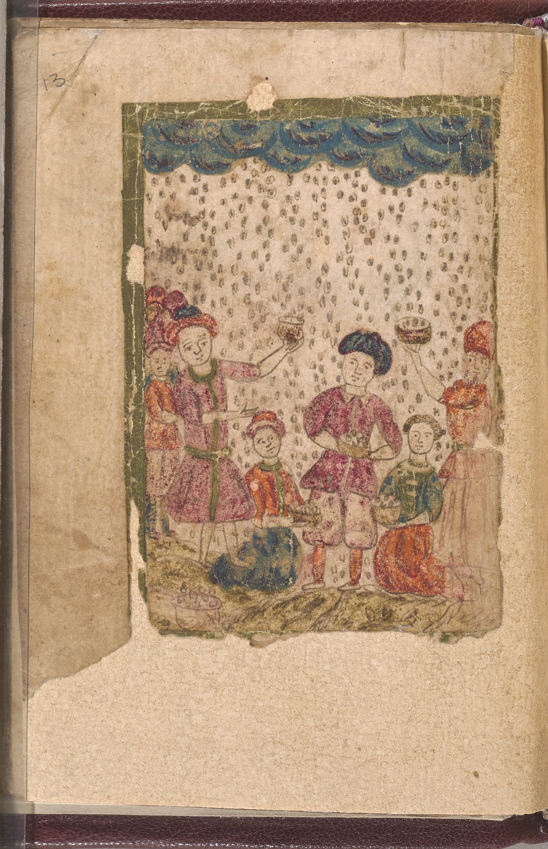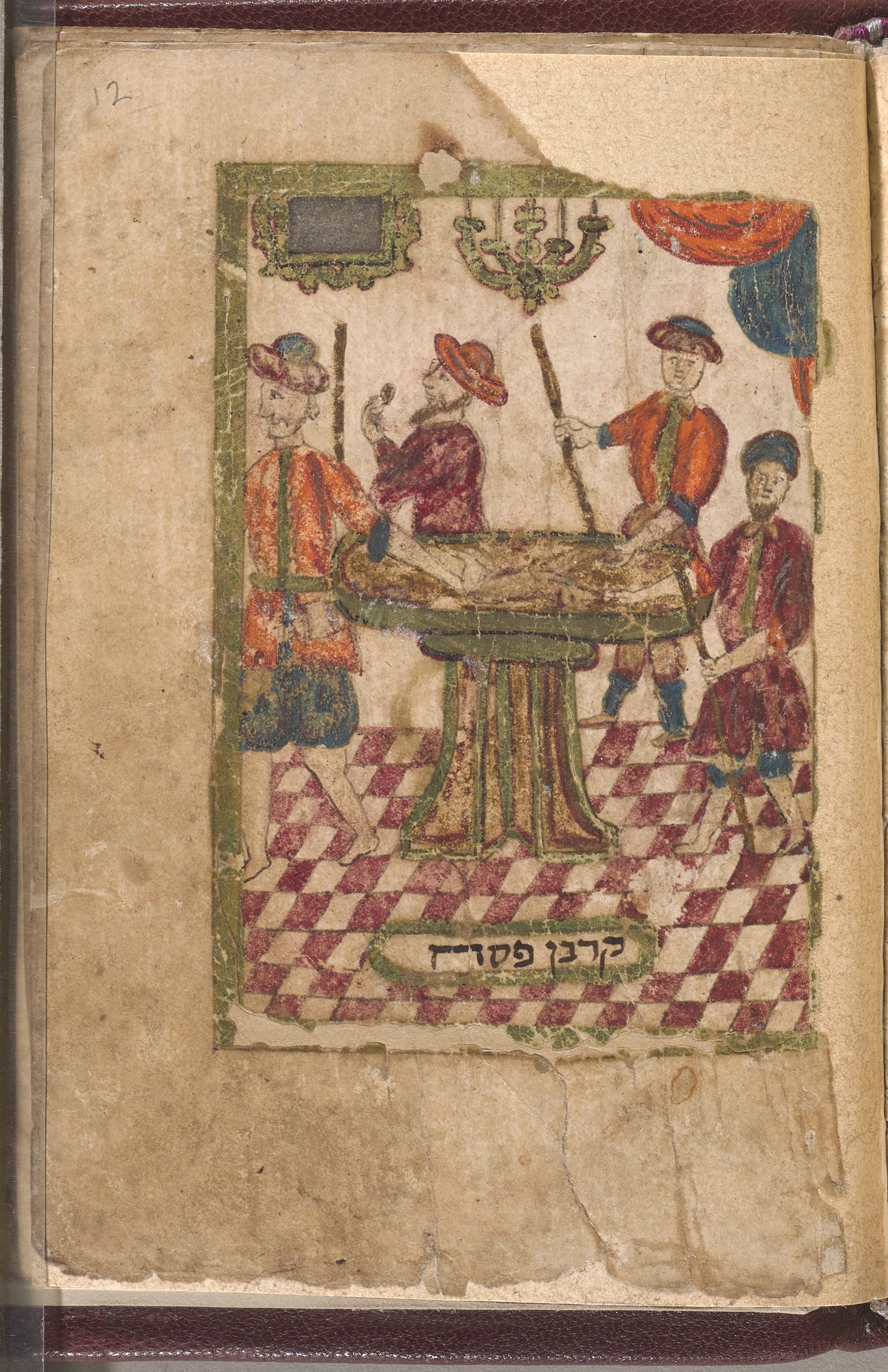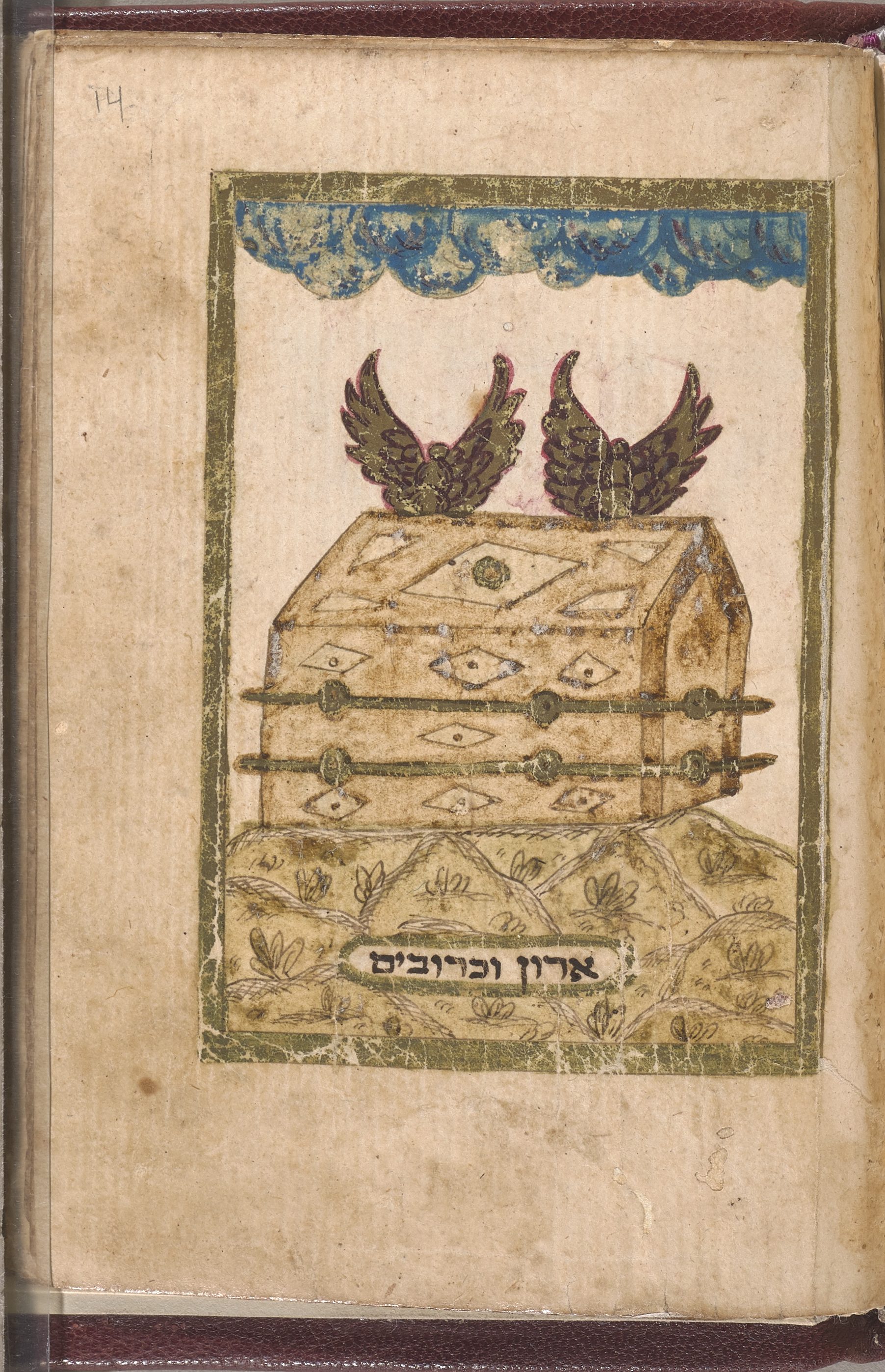 This page is one of several illustrations of biblical scenes from the Exodus cycle. You can see here a group of Jews enjoying a meal in a sukkah—a booth that was the temporary dwelling in the desert. Note the dress of those represented; their garments are unmistakably in the fashion of 18th century Greece.