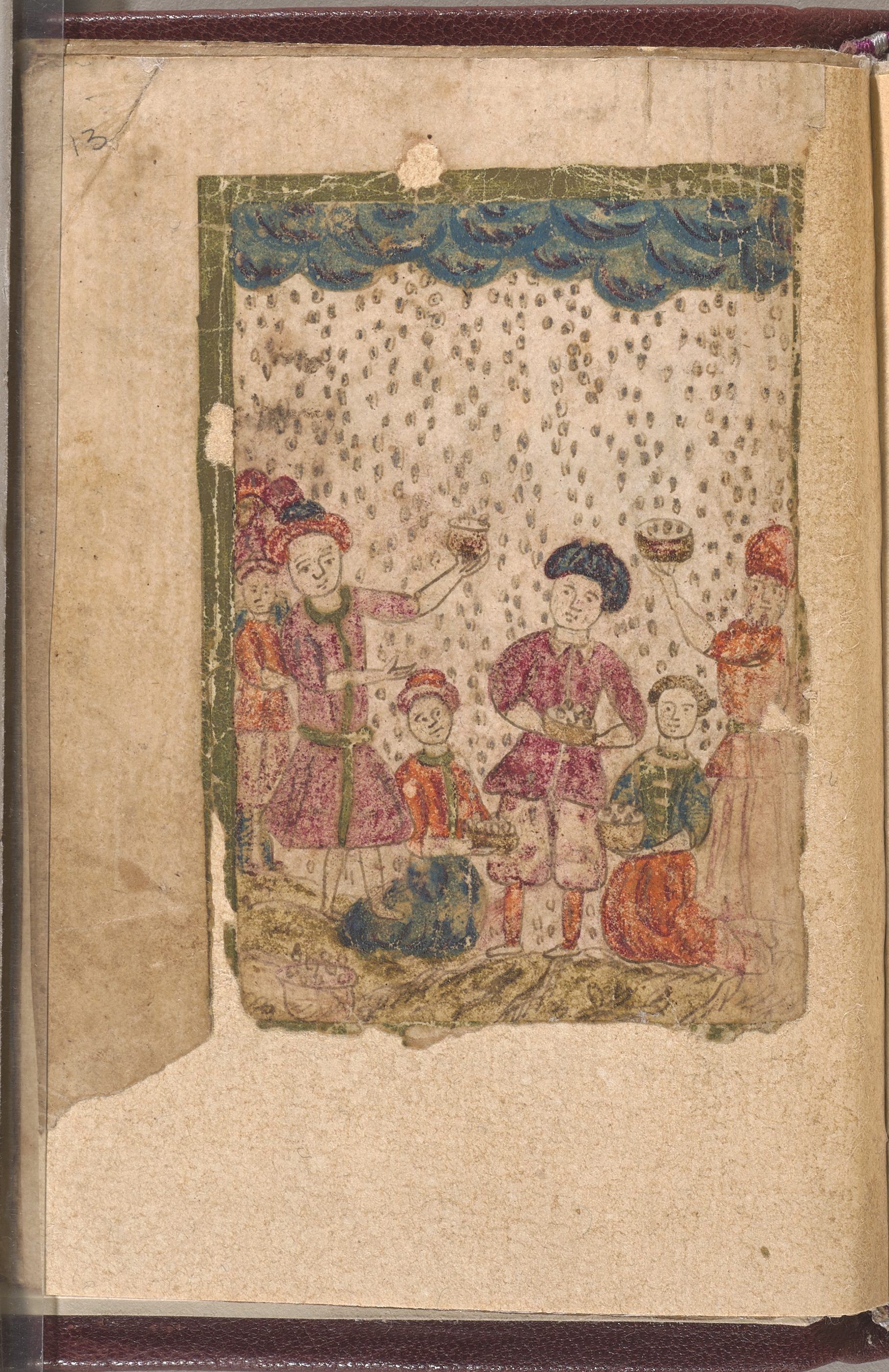 This page is one of several illustrations of biblical scenes from the Exodus cycle. Here you can see the children of Israel in the desert gathering the manna as it descends from heaven. Note the dress of those represented; their garments are unmistakably in the fashion of 18th century Greece.