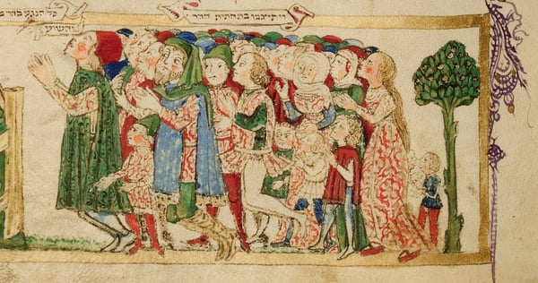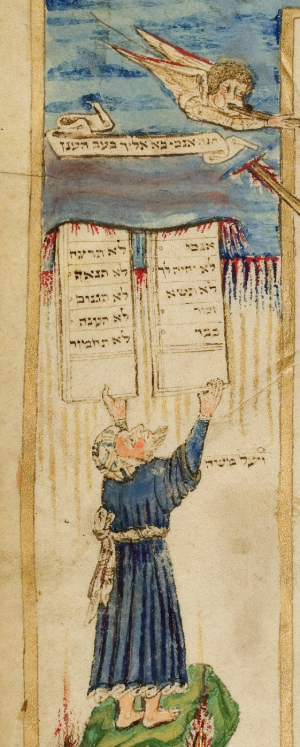 Notice the garments of the Jews gathered at the foot of the mountain. These are indistinguishable from those of the Jew’s Christian neighbors, showing again that Jews and their neighbors shared many styles and practices.