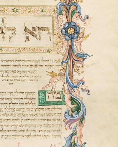Outstanding on this page, as on others, are the little naked child-angels, called “putti.” Do these images strike you as out of place in a Jewish manuscript? They are actually quite common. Angels were an important part of Jewish tradition, and the second commandment’s prohibition upon such images was observed mostly in the breach.