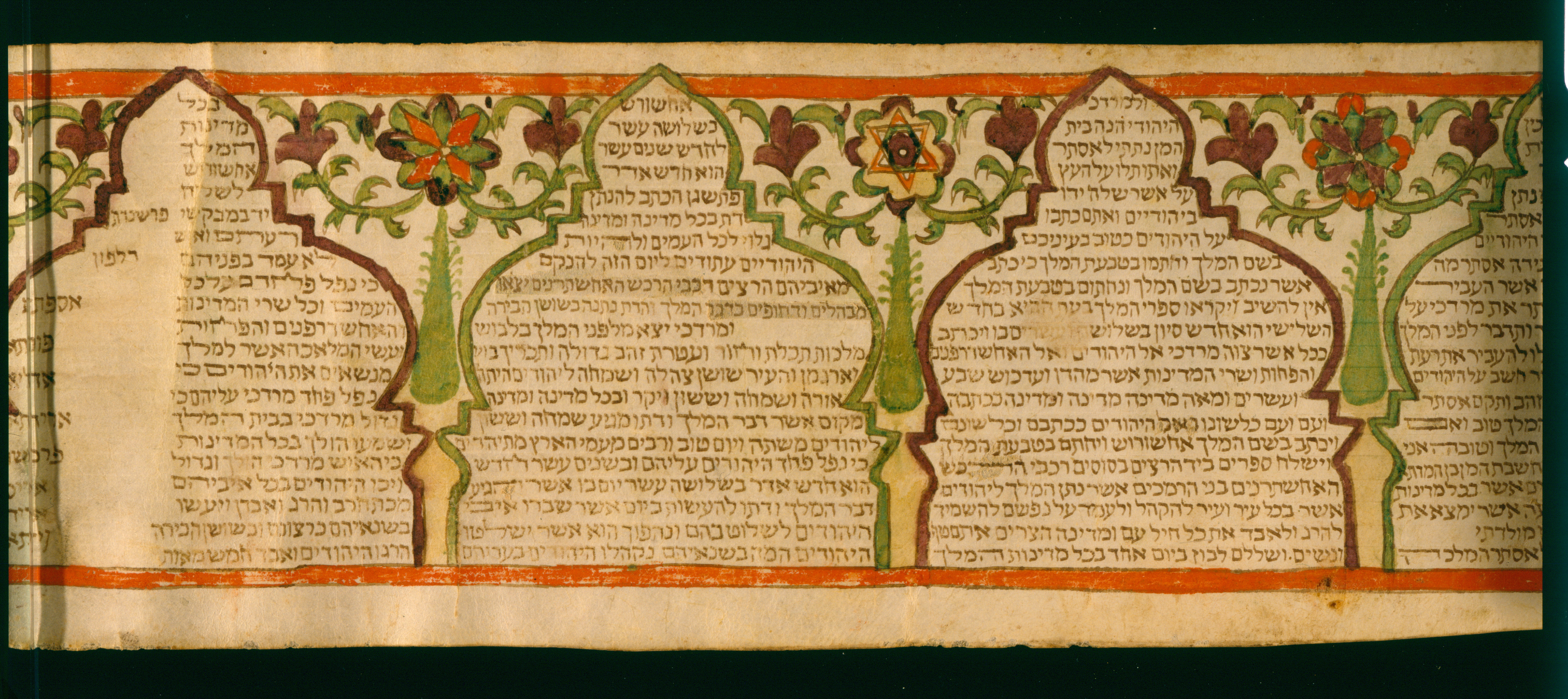 This Megillah, from North Africa, is beautifully decorated but lacks figural imagery, reflecting its Islamic context, where depictions of the human form were generally forbidden or discouraged. As a result, megillot and decorated Hebrew manuscripts created in Muslim lands rarely include figural art. The scroll’s design elements—particularly the pointed horseshoe arches and the six-pointed star—resembles those on ketubbot from Oran, Algeria, suggesting this as a possible place of origin.