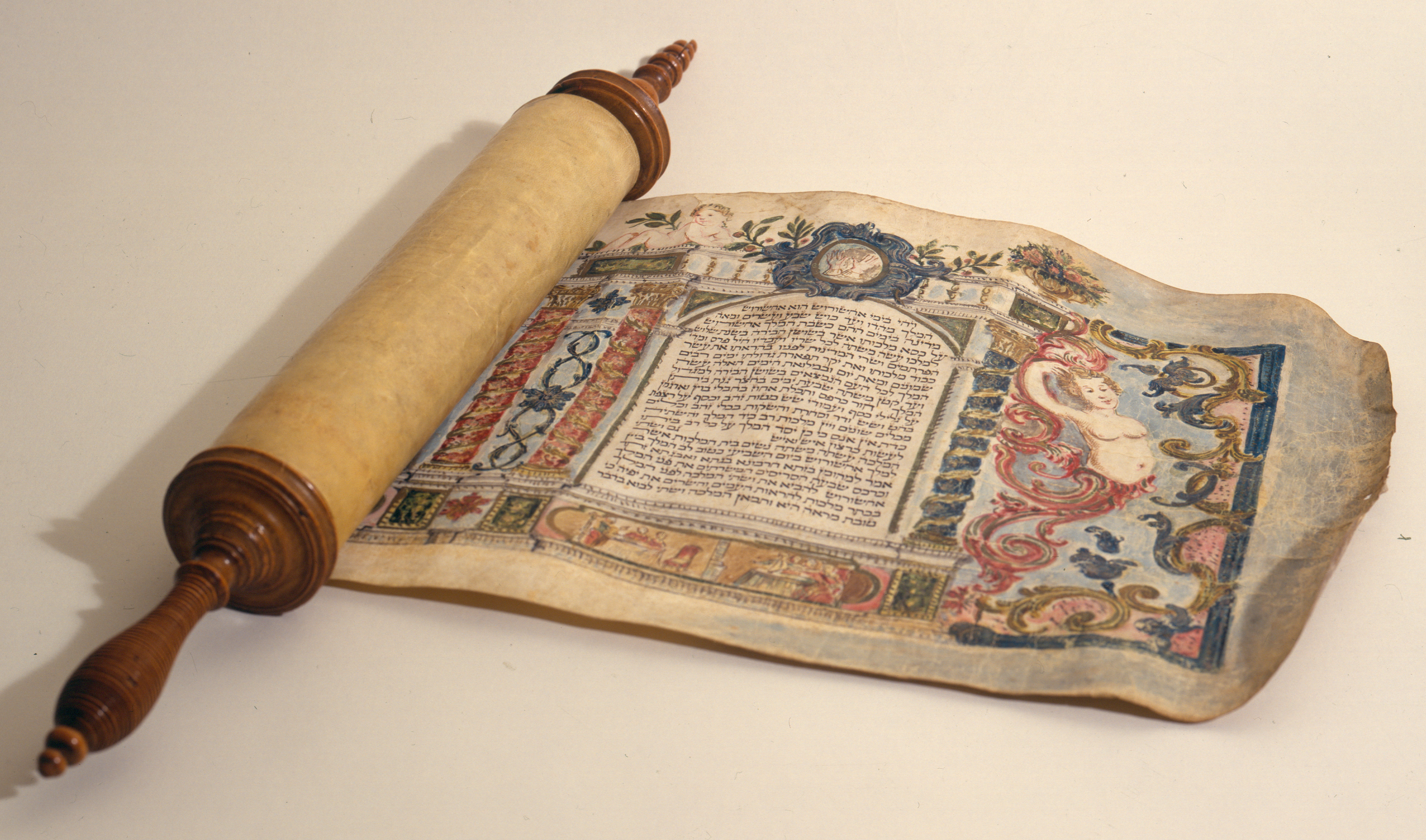 Although the Rabbis prohibited the decoration of Torah scrolls because they contain the name of God, artistic embellishment of Esther scrolls was permitted as the text does not include the Divine name. The earliest decorated scrolls of Esther date to the mid-16th century, and the custom of elaborately decorating these scrolls flourished in the 17th and 18th centuries, particularly in Italy. This scroll is a wonderful example of that development. Putti recline on the upper balustrade throughout the megillah, the columns of text are framed by elaborate architectural columns, like those that could be seen in Italian cathedrals, and the story recounted in each column is illustrated in the spaces at the bottom of each. But particularly surprising is the image of the nude torso of a woman at the beginning of the megillah. What is such an image doing in a sacred text that will be used for religious purposes? Quite simply, the Jews who produced and used this scroll were culturally good Italians. They therefore decorated their important objects in the same fashion as did their Christian neighbors