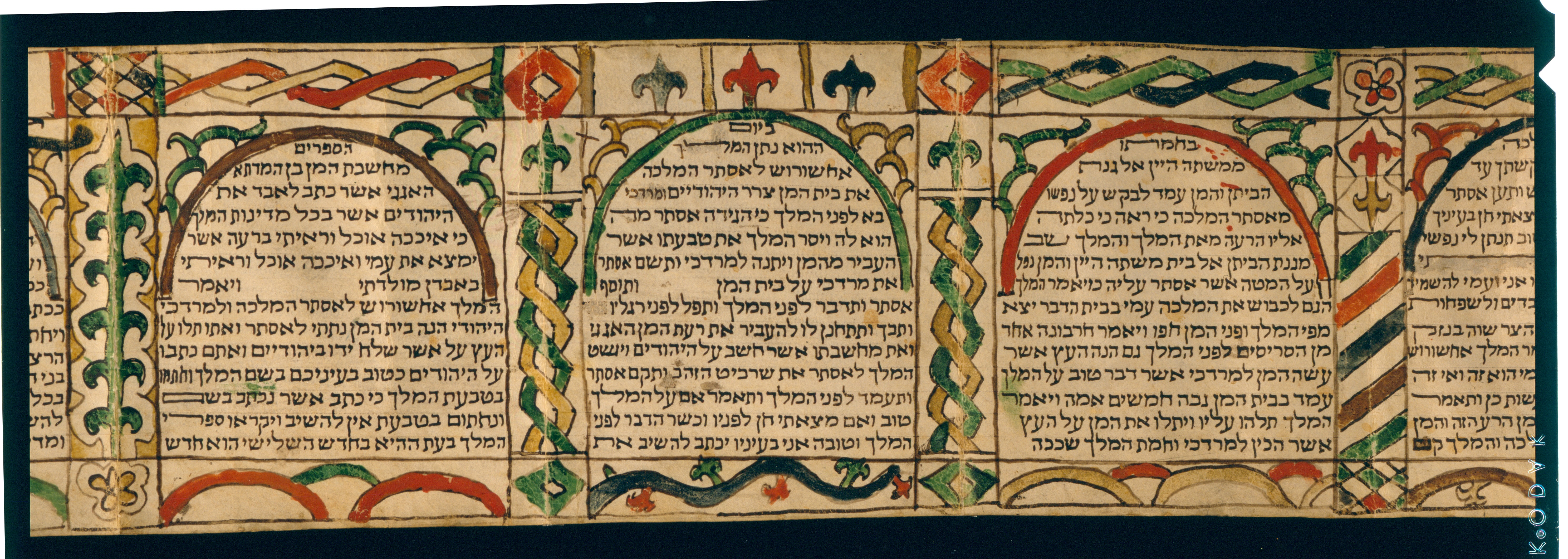 Because megillot often lack scribal inscriptions, they can be difficult to date or localize with certainty. However, by comparing this scroll with decorated Jewish marriage contracts—which consistently record the date and city of production—it is possible to identify Morocco as the most likely place where this work was created. Its vibrant red and green colors and decorative motifs, as well as its lack of figurative representation, are characteristic of ketubbot and megillot produced in Morocco during the 19th century.