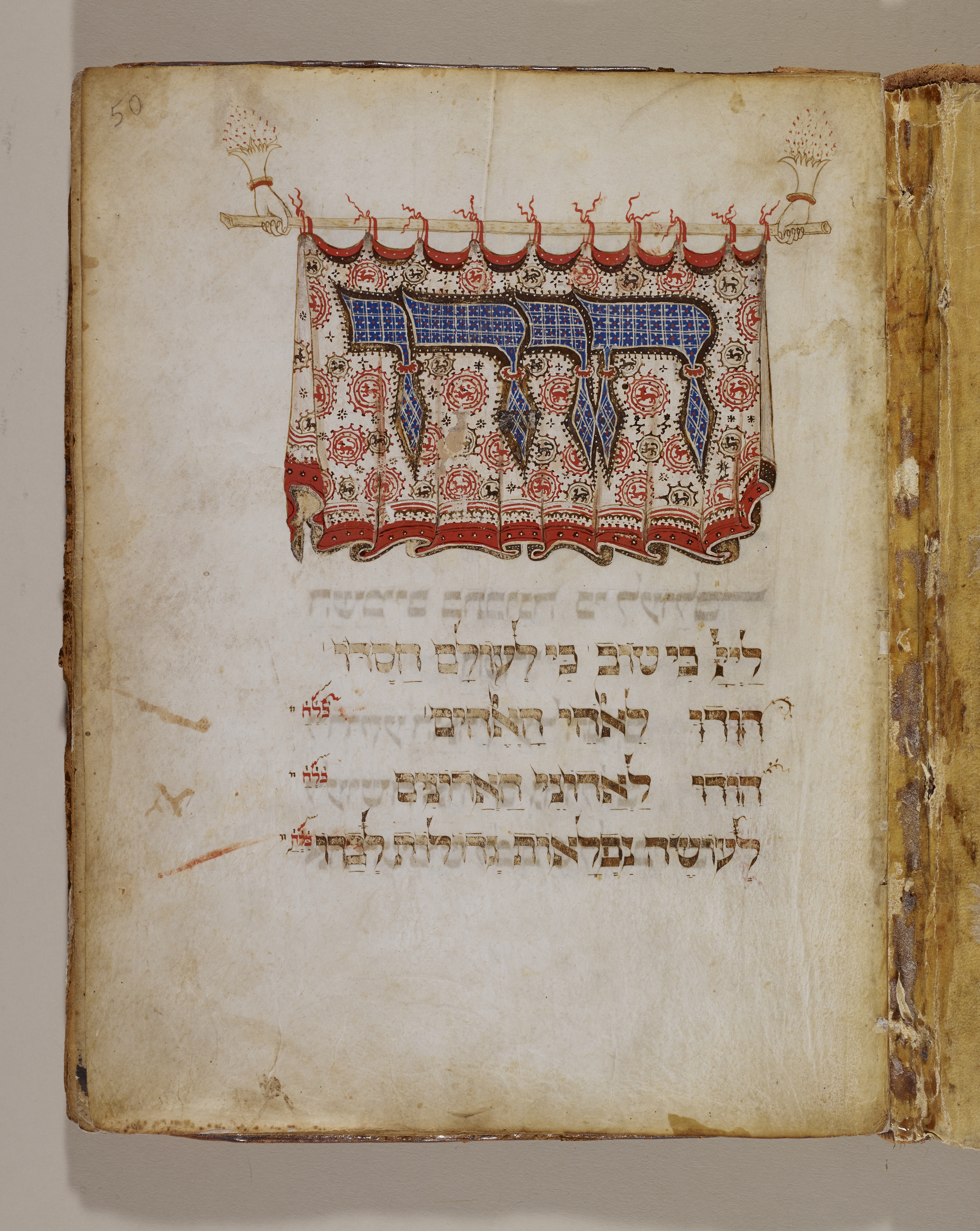 This page, emphasizing the opening words of one of one of the Hallel Psalms, is another example of Joel ben Simeon's exceptional artistic skills. His rendering of the flowing cloth frame, hanging from a curtain bar, has few parallels. Even the disembodied hands supporting the bar contribute to the overall beauty of this page.
