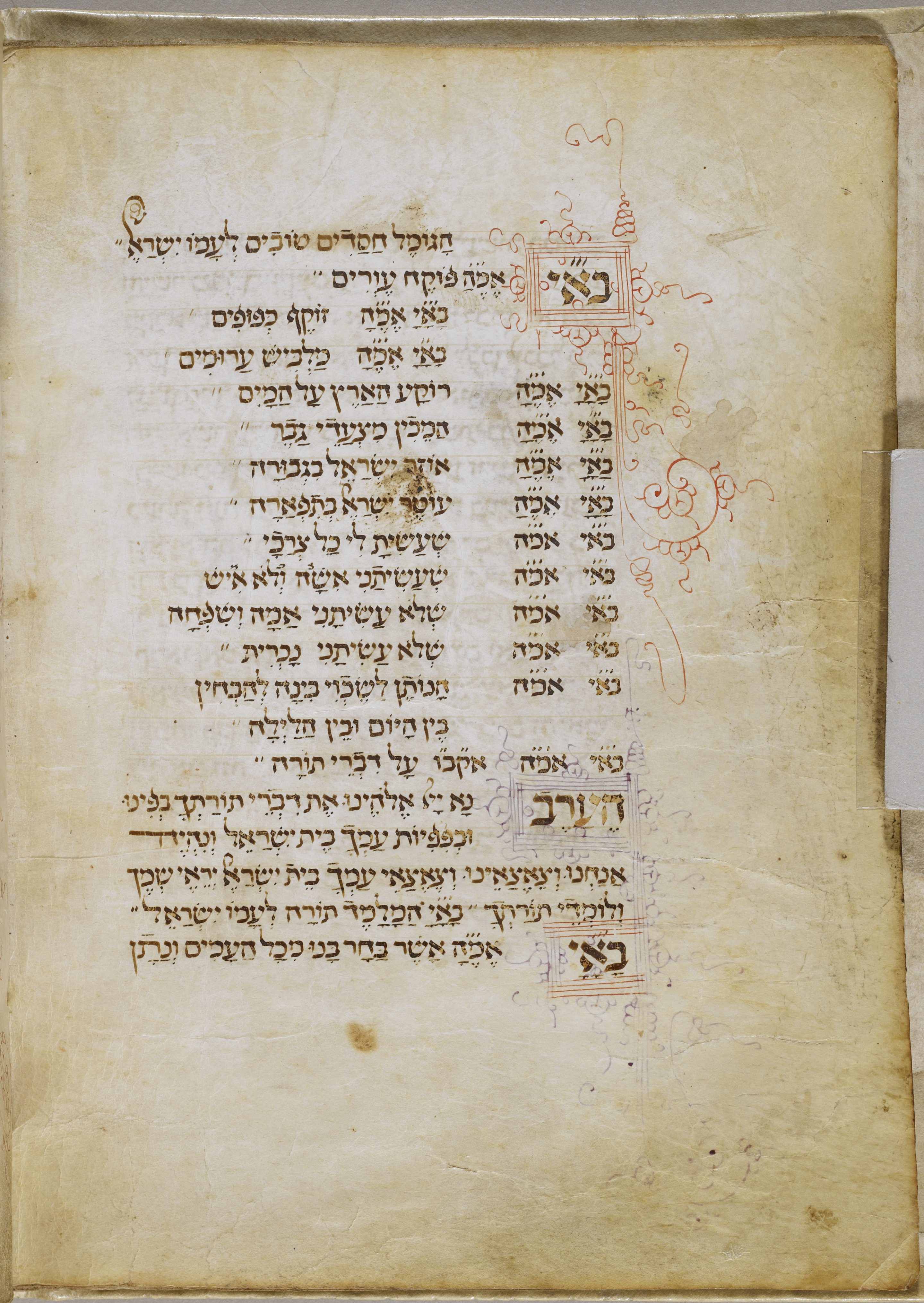 This beautiful siddur (prayer book), following the Roman rite, was written by the great Italian scribe, Abraham Farissol (ca. 1451- ca. 1525). Farissol performed many responsibilities in the Jewish communities of northern Italy, but he was particularly sought after as a scribe. This siddur is distinguished by Farissol’s magnificent writing, on fine parchment.