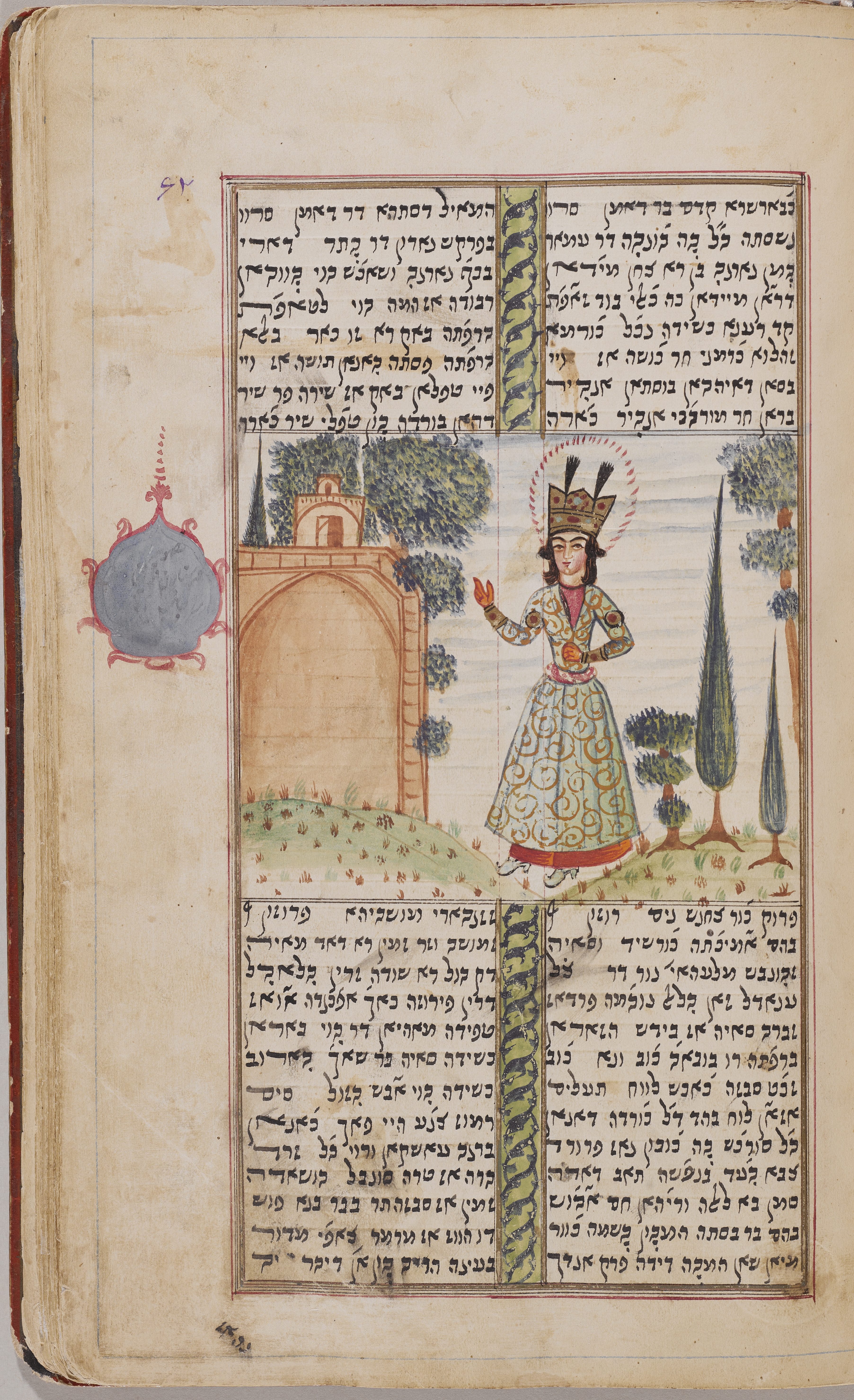 This manuscript was produced in Mashhad, Persia (Iran), in 1853. Written in Judeo-Persian and magnificently illustrated, this work took shape at a difficult time for Mashhadi Jews. In 1839, anti-Jewish riots led to forced conversion of Mashhad’s Jews, many of whom continued Jewish practices in secret. The current text, a Sufi version of the Yusuf and Zulayka story, was produced by nominally Muslim former Jews, therefore. But the manuscript is obviously the product of much love on the part of its creators—it is not a work done begrudgingly by resentful recent converts. Given the fact that Jews living in Muslim lands were for centuries attracted to the teachings of Sufism, it is more likely that this manuscript is testimony to that long-standing attraction.
